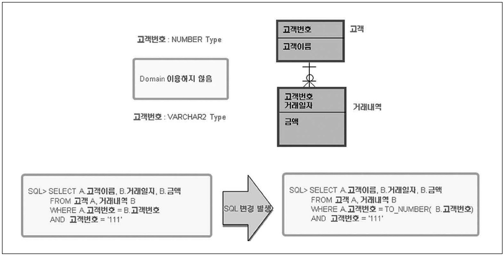 이러한 문제를 예방하기 위해서는 도메인을 이용해 동일하거 나 유사한 속성에 같은 데이터 타입을 사용해야 한다.