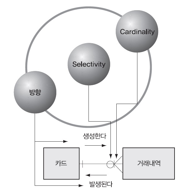 <그림 1>의 예제에서 카드 엔티티와 거래내역 엔티티가 존재하며 해당 엔티티들을 확대해보면 두 엔티티 사이에는 관계가 존재한다. 여기에는 관계의 3요소가 존재한다.