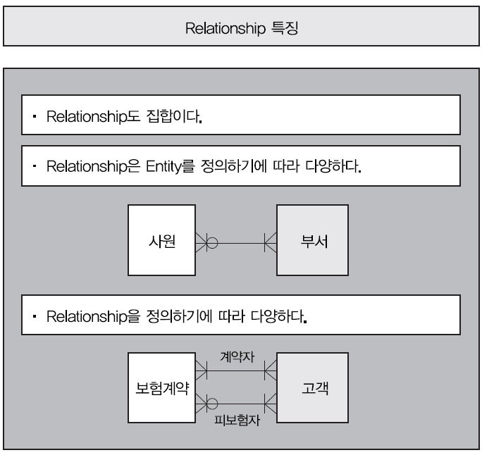 이처럼 관계는 엔티티에 어떤 데이터가 포함됐는가에 따라 그 해석이 달라질 수 있다. 엔티티의 성격이 관계에 영향을 끼치는 것이다. 이러한 관계의 특징은 다음과 같이 정의할 수 있다.