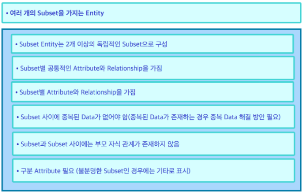 각각의 서브셋은 다른 속성과 관계를 가질 수도 있다. 이처럼 상이한 속성과 관계가 많은 경우 엔티티 분할을 고려할 수 있다.