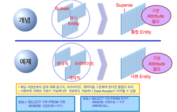 서브셋들이 각각의 엔티티로 구성돼 있는 경우 수퍼셋으로 엔티티를 통합할 수 있다. 이 경우 각각의 서브셋을 구별하기 위한 구분 속성이 필요하다.