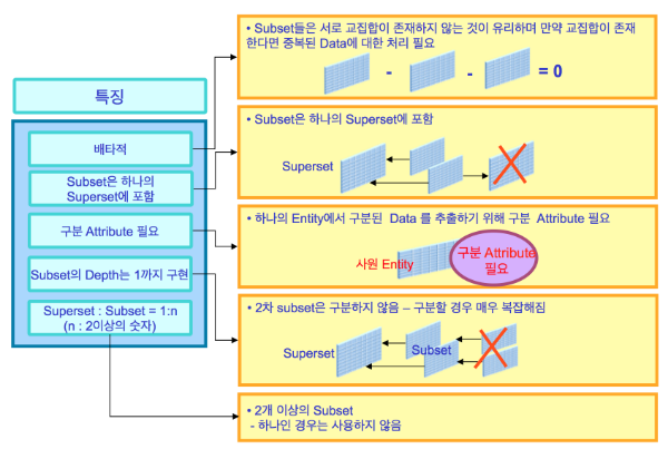 하나의 수퍼셋으로 구성된 엔티티는 필요에 따라 각각 서브셋을 별도의 엔티티로 분리할 수 있다. 이처럼 서브셋을 별도의 엔티티로 도출하면 엔티티 분할에서 언급했듯 유연성이 높아지지는 이점이 있지만 SQL이 복잡해질 수 있다. 수퍼셋과 서브셋의 특징은 다음과 같다.