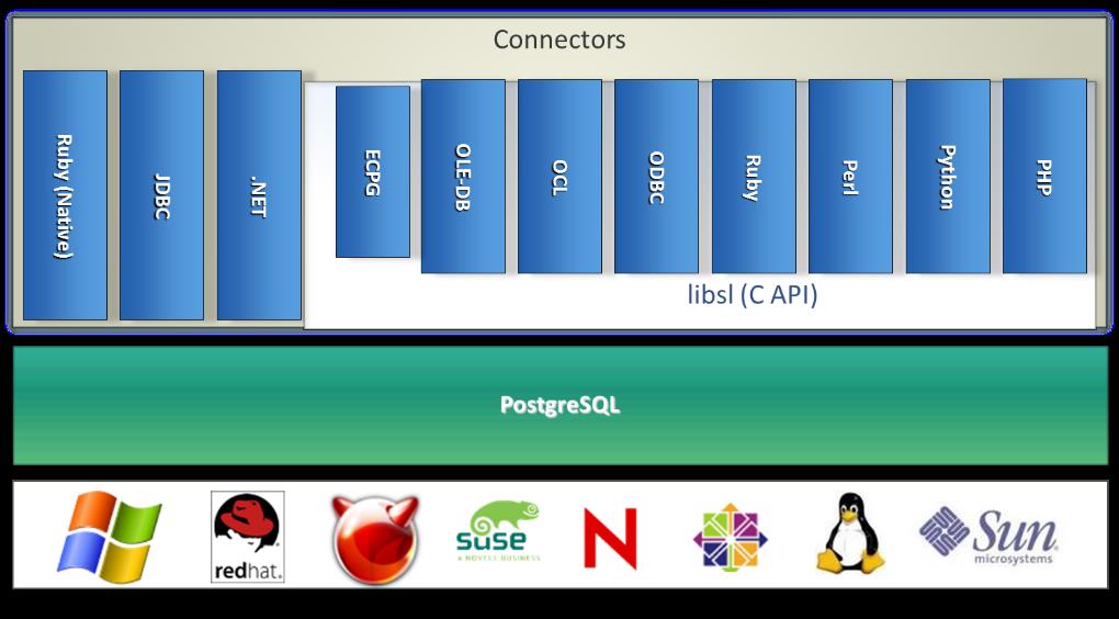 PostgreSQL 은 Windows, Linux, Unix 등 다양한 OS를 지원하고 있으며 .NET, JDBC 등의 Connector들을 제공하고 있다.