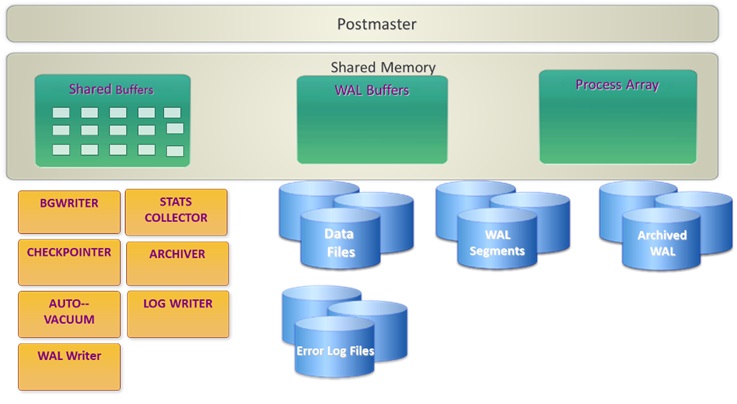 포스트마스터(Postmaster)라는 main process가 있으며, child process로 유틸리티 프로세스가 실행되어 동작된다. Postmaster에서는 유틸리티 프로세스가 죽으면 restart 시킨다.
