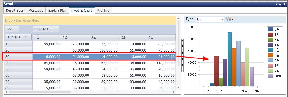 왼쪽의 그리드에서 DEPTNO 컬럼이 30인 데이터를 선택하면 오른쪽에 차트가 그려집니다.