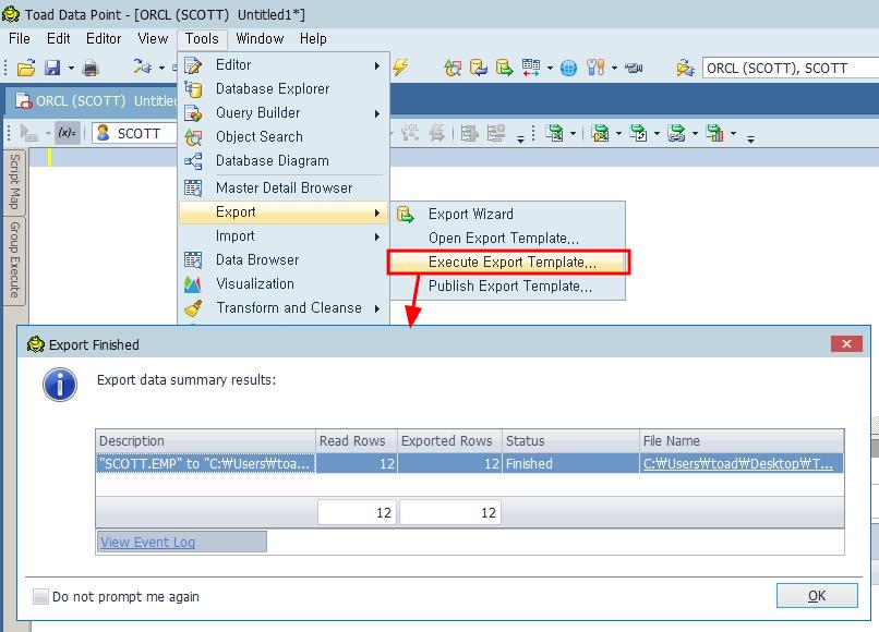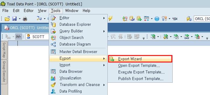 Toad Data Point는 테이블이나 뷰 등의 데이터를 Excel, CSV나 SQL Script로 추출할 수 있습니다. 사용 방법은 Menu > Tools > Export > Export Wizard를 선택합니다.