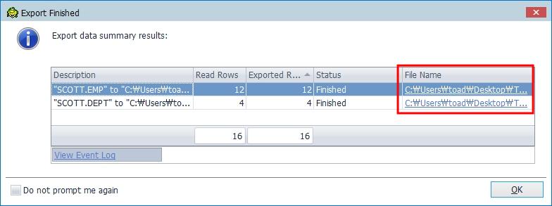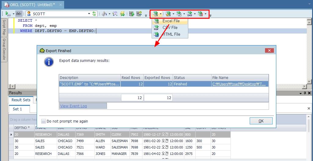 Editor 창에서 쿼리 수행 후 결과를 바로 Export 하고 싶은 경우, 툴바에서 바로 Export 관련 아이콘을 선택하면 바로 수행되며 File Name을 누르면 엑셀 파일을 열 수 있습니다.