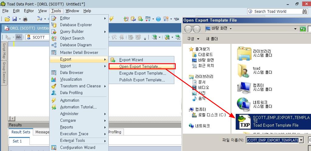 별다른 수정 없이 Export 작업을 수행한다면 Menu > Tools > Export > Execute Export Template를 누르고 템플릿 파일을 선택하면 바로 Export가 수행됩니다.