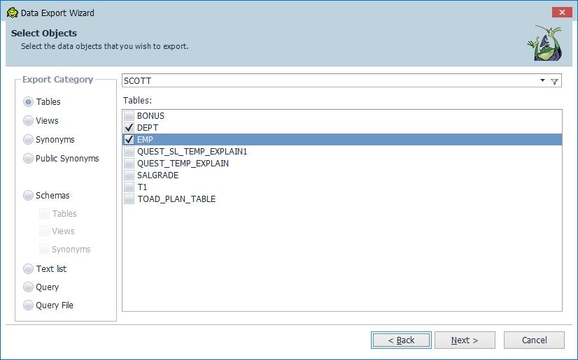 Export 할 오브젝트를 선택합니다. 테이블이나 뷰처럼 오브젝트를 선택할 수도 있지만 유저 전체의 데이터를 추출하거나 특정 SQL문을 이용하여 데이터를 추출할 수도 있습니다. 여기서는 SCOTT 유저의 테이블 중에서 DEPT와 EMP를 선택하고 Next버튼을 누릅니다.