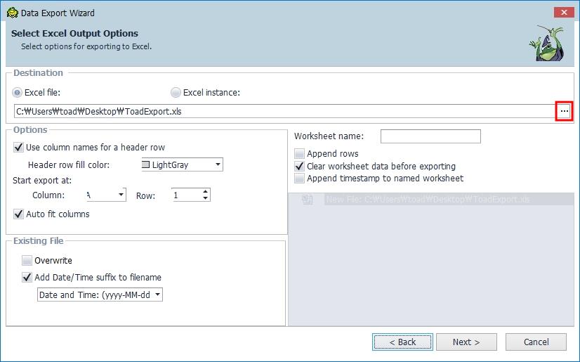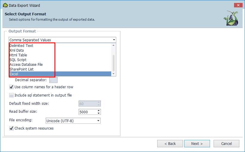 다음은 Export 받을 파일의 형식을 지정합니다. CSV나 텍스트 파일 등으로 저장이 가능하며 여기서는 가장 많이 사용하는 엑셀을 지정합니다.