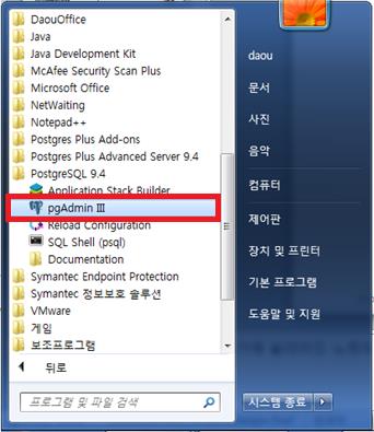 [시작]-[모든프로그램]-[PostgreSQL 9.4]에서 pgAdmin III 실행파일을 더블 클릭하여 실행시키면 다음과 같은 화면이 실행됩된다.