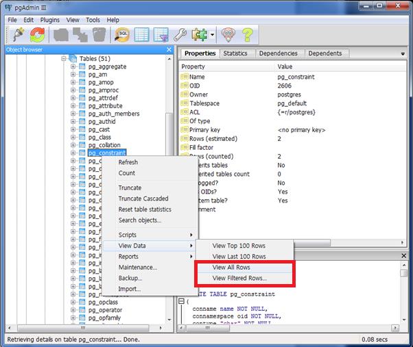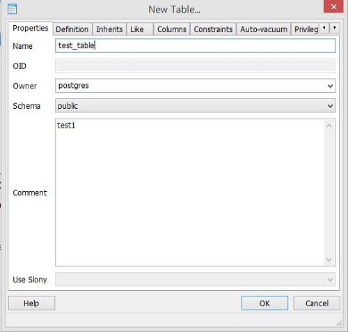 Properties에서는 테이블의 name과 Owner를 설정하고 테이블에 대한 Comment를 달 수 있다 Definition에서는 Tablespace와 타입을 지정하고 상속받거나 제약조건, vacuum, security Labels, SQL등을 설정 할 수 있다.