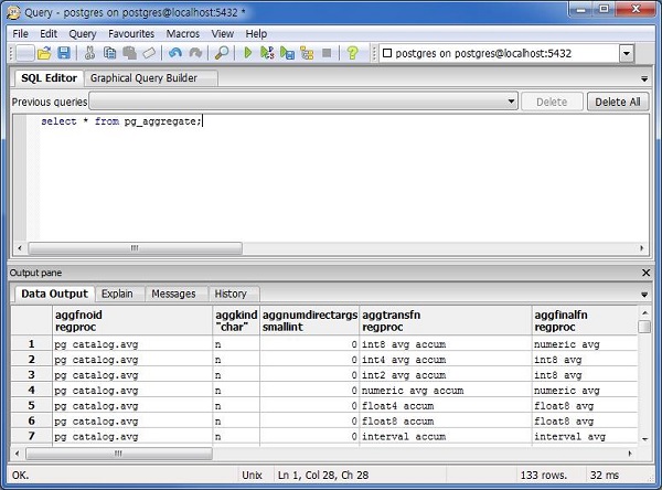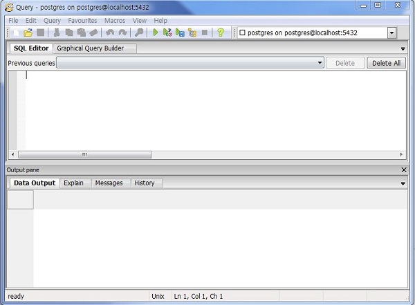 Query Tool에서 SQL Editor에 query문을 입력하면 그 결과를 Data Output을 통해 확인할 수 있고Explain을 통해 테이블 간의 연관 관계를 시각화 하여 파악할 수 있다. Messages를 통해 query가 성공적으로 수행 되는지 확인할 수 있으며 History는 실행되었던 query문을 체크할 수 있다.
