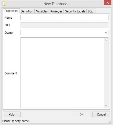 Properties에서는 Database의 name과 Owner를 설정하고 Database에 대한 Comment를 달 수 있다. Definition에서는 Tablespace와 Encoding타입을 지정할 수 있고, Variables, Privileges, security Labels, SQL등을 설정 할 수 있다.