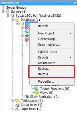 Database를 오른쪽 마우스로 클릭하면 Backup과 Restore를 설정할 수 있습니다.