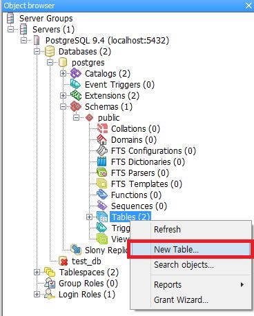Create the new object of the same type as the selected object | 서버에 새로운 Database, Event Triggers, Extensions, Schemas, Slony Replication등을 생성할 수 있음 |