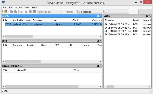 서버의 상태를 확인하기 위해서는 [Tools]-[server status]를 클릭하면 상태를 확인할 수 있다. Activity에서 현재 활동하고 있는 서버를 확인할 수 있고 Logfile에서 접속했던 log를 확인할 수 있다.