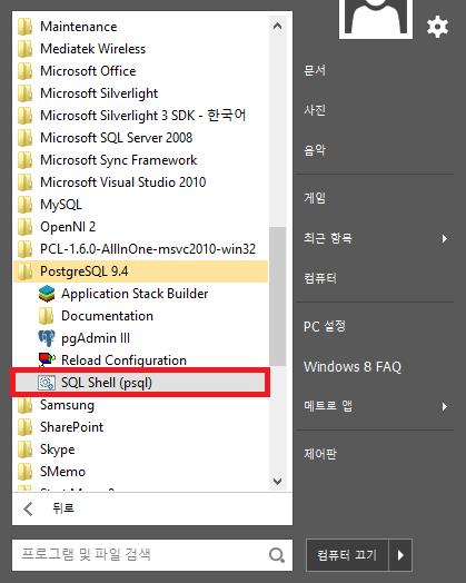 Psql은 PostgreSQL의 Command Line Interface입니다. [시작]-[모든프로그램]-[PostgreSQL 9.4]에서 SQL shell(psql)실행파일을 더블 클릭하여 실행시키면 다음과 같은 화면이 실행된다.