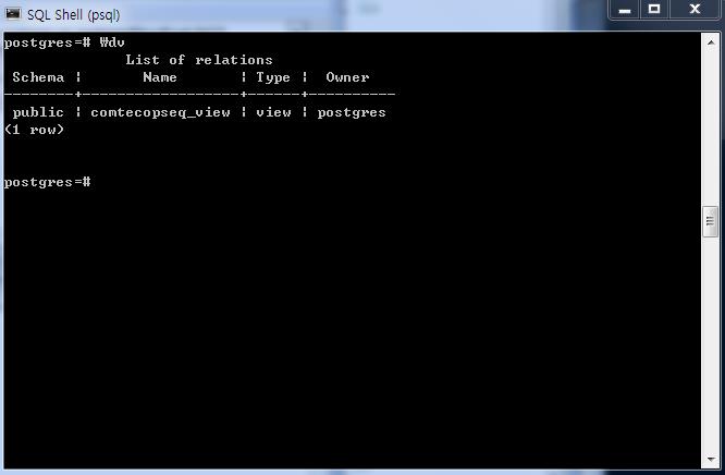 Database내의 view에 대해서 확인하고 싶을 때는 \dv를 이용하여 확인할 수 있다.