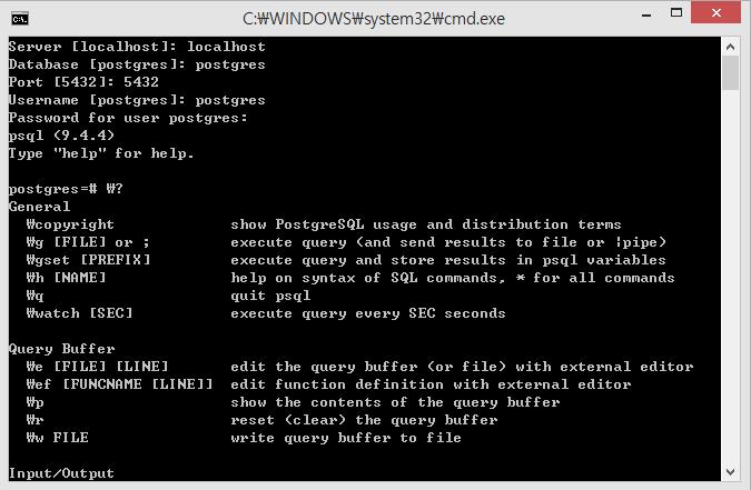 psql의 명령어에 대한 정보를 얻고 싶을 때는 먼저 cmd창에 \? 를 입력하면 명령어에 대한 정보를 얻을 수 있다.