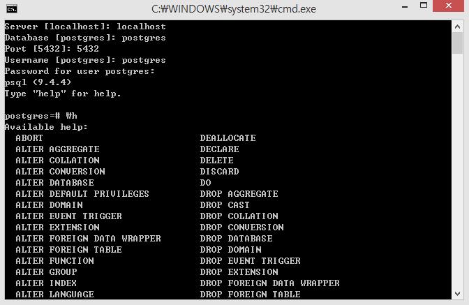 SQL명령어에 대한 정보를 얻고 싶을 때는 cmd 창에 \h 를 입력하면 SQL명령어에 대한 정보를 얻을 수 있다.