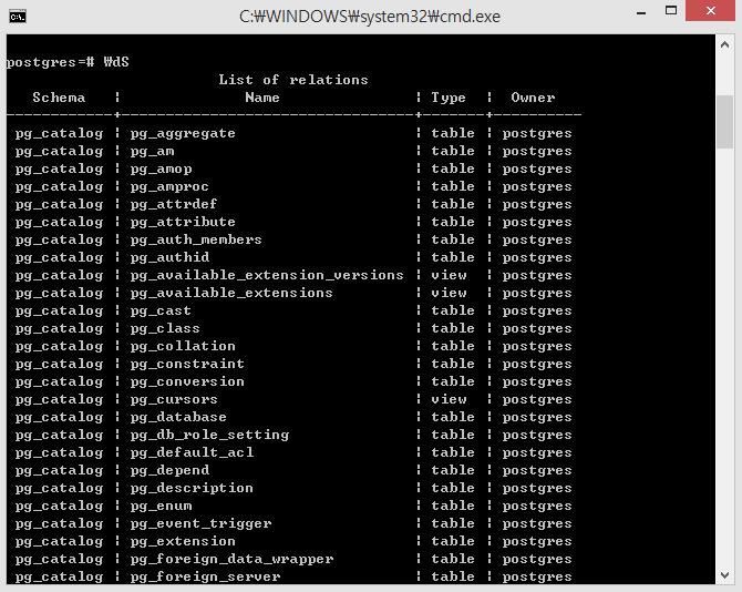 Database내의System table에 대해서 확인하고 싶을 때는 \dS를 입력한다.