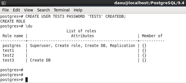 CREATE USER TEST3 PASSWORD 'TEST3' CREATEDB;