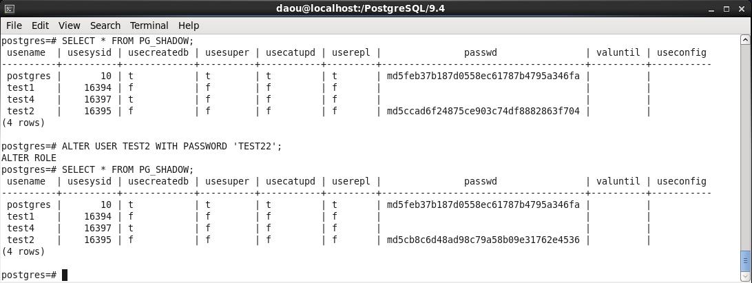 ALTER USER TEST2 WITH PASSWORD 'test22';