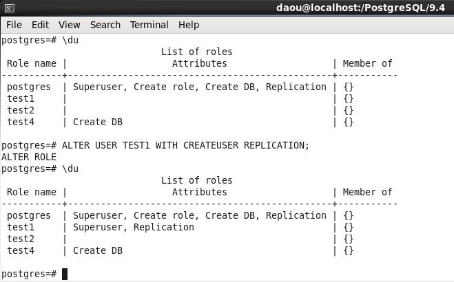 ALTER USER TEST1 WITH CREATEUSER REPLICATION;