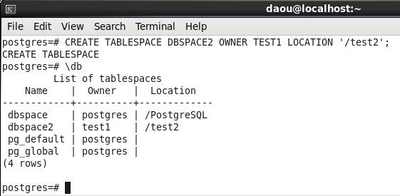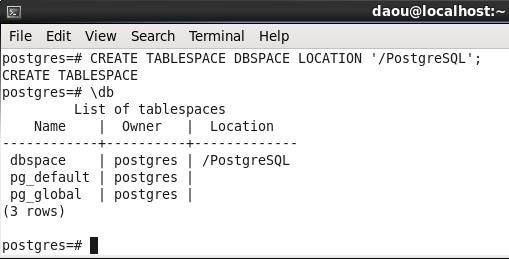 CREATE TABLESPACE DBSPACE LOCATION '/PostgreSQL';