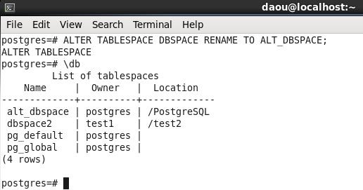 ALTER TABLESPACE DBSPACE RENAME TO ALT_DBSPACE;