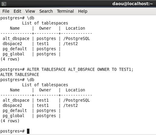 ALTER TABLESPACE TESTSPACE OWNER TO POSTGRES;