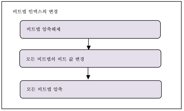 비트맵 인덱스는 비트값들을 압축해 리프 블록에 저장한다. 이 덕분에 작은 크기에 더 많은 비트맵을 저장할 수 있는 이점이 있다. 그러나 해당 비트값이 변경돼야 할 때에는 얘기가 달라진다.