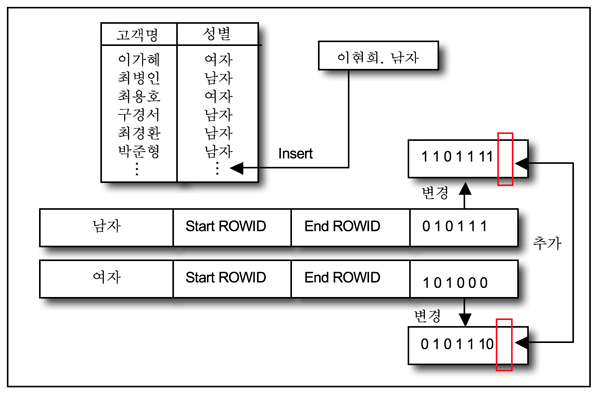 <그림 2>처럼 <이현희, 여자>라는 데이터가 테이블에 삽입(Insert)되면 비트맵 인덱스에도 < 이현희, 여자>에 대한 비트맵이 추가된다. B*TREE 인덱스처럼 <이현희, 여자>를 인덱스 엔트리에 삽입하는 것이 아니라 모든 컬럼 값의 비트맵에 해당 데이터의 비트값을 추가한다.