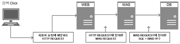 [그림 2-1]의 일반적인 3-Tier 구조 웹서비스 인프라 환경을 살펴보자. 웹서버가 제공한 화면에서 사용자가 특정 조건을 선택한 후 검색 버튼 등을 통해 데이터를 불러오기 위한 이벤트를 발생시키면 1) 가장 먼저 웹서버에 HTTP REQUEST가 도착 한다.