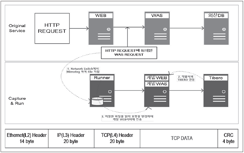 1. 웹서버 혹은 와스서버에 전송되는 REQUEST를 “캡처하여 파일로 저장”하고 “해당 파일을 읽어 티베로와 연결된 웹 혹은 와스서버에 전송”할 수 있다면 부하 재현이 가능할 것이다(티베로와 연결될 웹, 와스서버는 외산DB와 연결된 것과 동일한 콘텐츠로 구성되어 있는 개발서버 등을 활용하면 쉽게 구성이 가능할 것으로 예상된다).