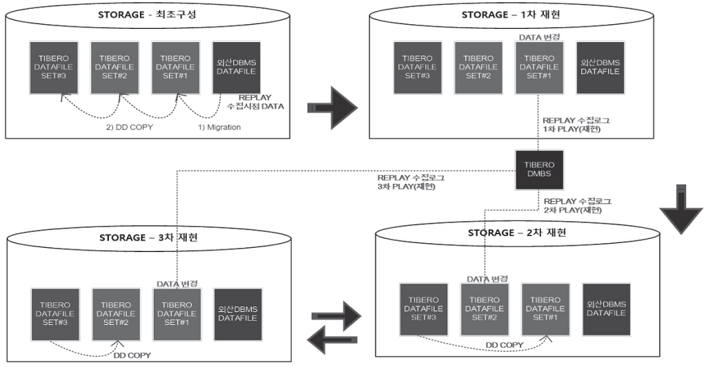 3. STORAGE - 2차 재현 : 1차 재현 시 발생한 이슈의 개선이 완료되면 데이터 파일 SET #2를 통해 티베로를 OPEN하고 PLAY(재현)한다. 그리고 동시에 SET #3을 SET #1로 DD COPY하여 1차 재현 시 변동된 데이터를 수집 시점으로 원복한다.