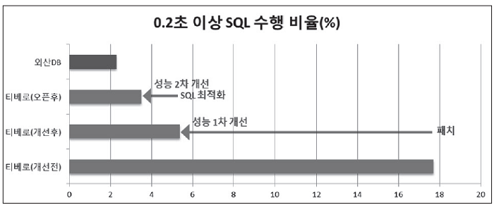 그림 3-11에서 소개했던 0.2초 이상 소요되는 SQL 수행 비율을 다시 한 번 살펴보면 1. 리플레이를 수행하며 패치하는 과정에서 성능이 1차적으로 개선되었고 부족한 부분은 2. SQL을 최적화함으로써 외산 DBMS 수준과 유사하게 성능을 개선한 것을 확인할 수 있다.