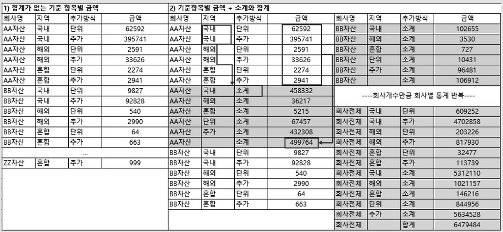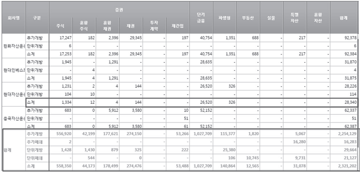 먼저 소속 회사가 ‘http://freesis.kofia.or.kr’을 통해 서비스하고 있는 그림 4-2 를 보자. 해당 서비스는 기준 항목(회사, 구분)별 규모, 각각의 중간 합계(소계) 그리고 최종 합계를 제공한다.