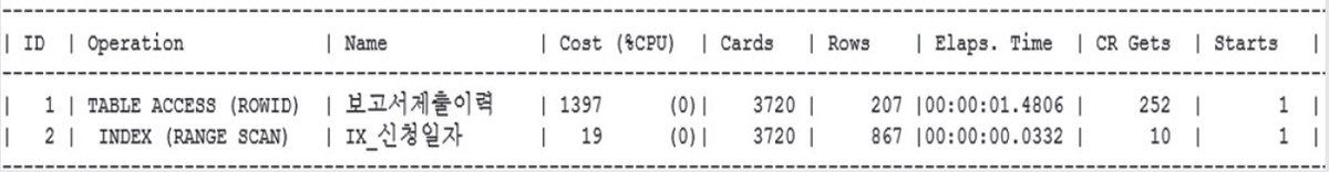 소속 회사는 그림 4-3과 같은 특정 기간 동안의 제출 보고서를 조회하는 화면이 다수 존재한다. 그리고 신청일자를 검색하는 SQL은 대부분 참고 4-14와 같이 구성되어 있으며 조회 시 문제없이 인덱스를 경유하여 관련 정보를 추출한다.