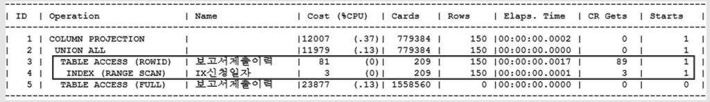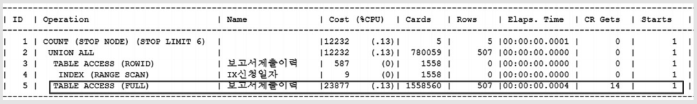 2) EQUAL 조건 NVL 사용 - 바인드 변수 미 입력 시(NULL) select * from 보고서제출이력 where 신청일자 = NVL(:신청일, 신청일자) AND ROWNUM <=5; PLAN이 두개로 잘 분리되어 있고, 바인드 변수를 입력 하지 않았으므로 FULL SCAN 플랜이 사용되었다.
