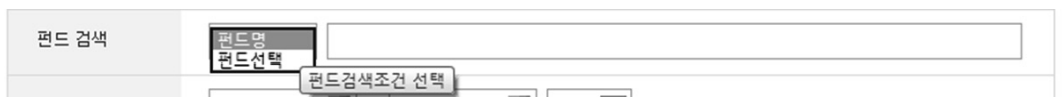 그림 4-4는 소속 회사의 전자공시 서비스의 펀드공시 검색 화면 펀드 검색 조건이 다. 사용자가 ‘펀드명’ 조건을 선택할 경우 우측의 텍스트 인풋 박스에는 펀드명 중 일부를 입력하게 되고 ‘펀드선택’ 조건을 선택할 경우는 펀드를 조회하는 다른 화 면을 제공하여 최종적으로는 펀드 코드를 입력받는다.