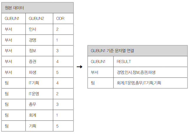, LISTAGG(GUBUN2, ',') WITHIN GROUP(ORDER BY ODR) RESULT_LISTAGG