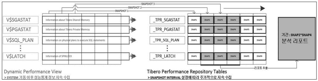 그러나 티베로 성능분석 리포트(Tibero Performance Repository(이하 TPR))는 성 능 통계 정보를 별도의 공간(SYSSUB 테이블스페이스)에 TABLE 형태(TPR 테이 블)로 주기적으로 자동 수집하고 해당 값을 이용하여 기간별 분석 리포트 출력 기 능을 제공한다. 따라서 관리자는 별도의 저장 작업 없이 TPR 테이블과 분석 리포 트를 활용하여 성능 분석이 가능하다.