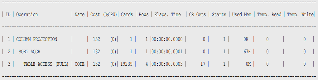 @tibero:/tibero/tibero6/scripts # tbsql sys/***** -- 필요 권한 부여 GRANT SELECT ON SYS.V$SQL TO TIBEROTEST; GRANT SELECT ON SYS.V$SQL_PLAN TO TIBEROTEST; GRANT SELECT ON SYS.V$SQL_PLAN_STATISTICS TO TIBEROTEST; @tibero:/tibero/tibero6/scripts # tbsql tiberotest/tibero --보유 권한 확인 SQL> SELECT TABLE_NAME, PRIVILEGE FROM USER_TAB_PRIVS; ---------------------- ------------- TABLE_NAME PRIVILEGE ---------------------- ------------- DBMS_SYSTEM EXECUTE V$SESSION SELECT V$SQL SELECT V$SQL_PLAN SELECT V$SQL_PLAN_STATISTICS SELECT --실행계획 수행 alter session set GATHER_SQL_PLAN_STAT='Y'; select --test01 sum(1) from TIBEROTEST.CODE; (--test01과 같이 임시적으로 id를 부여하면 sql_id를 검색할 때 편리하다)
