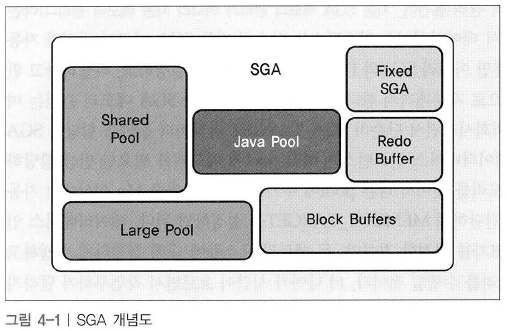 • Shared Pool : 공유 커서, 공유 프로시져, 고정 오브젝트, 딕셔너리 캐쉬와 같은 많은 데이터를 포함하는 공간