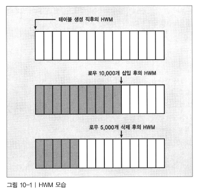 • 테이블의 데이터가 Delete 되어도 HWM 는 그대로 남는다.