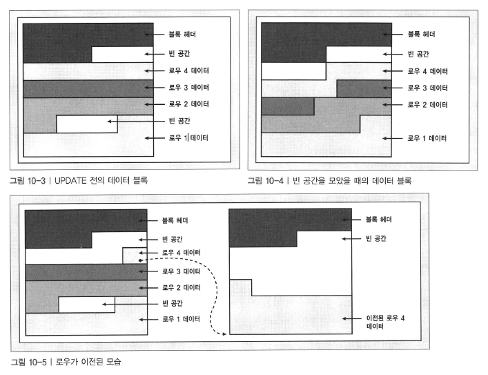 • 로우 이전 (Row Migration) : 로우가 너무 커져 있던 블럭에 머무르지 못하고 다른 블록으로 이전하는 것
